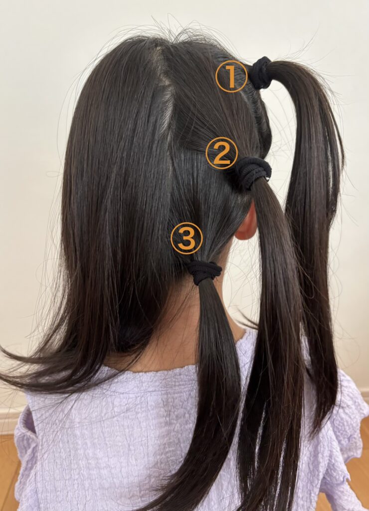 ② 髪を3つに分け太めのゴムで仮結びをします。