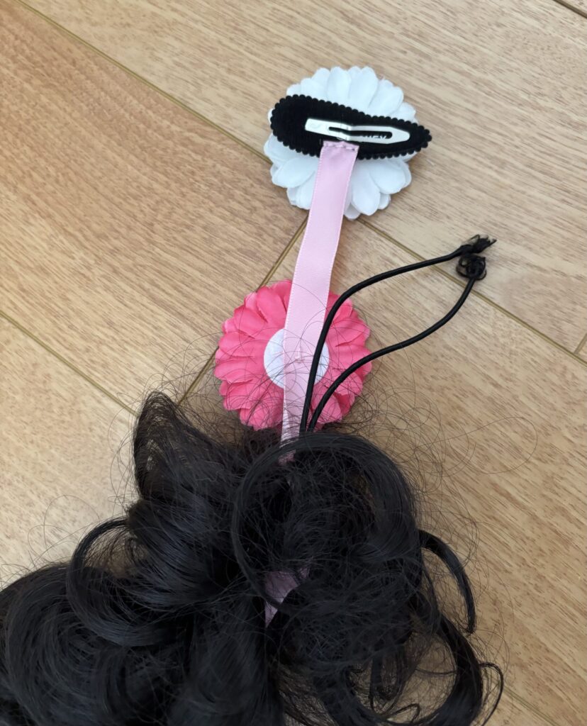 ②Uピンで、綺麗に見える位置に固定し花のピンを飾り付けて完成です。